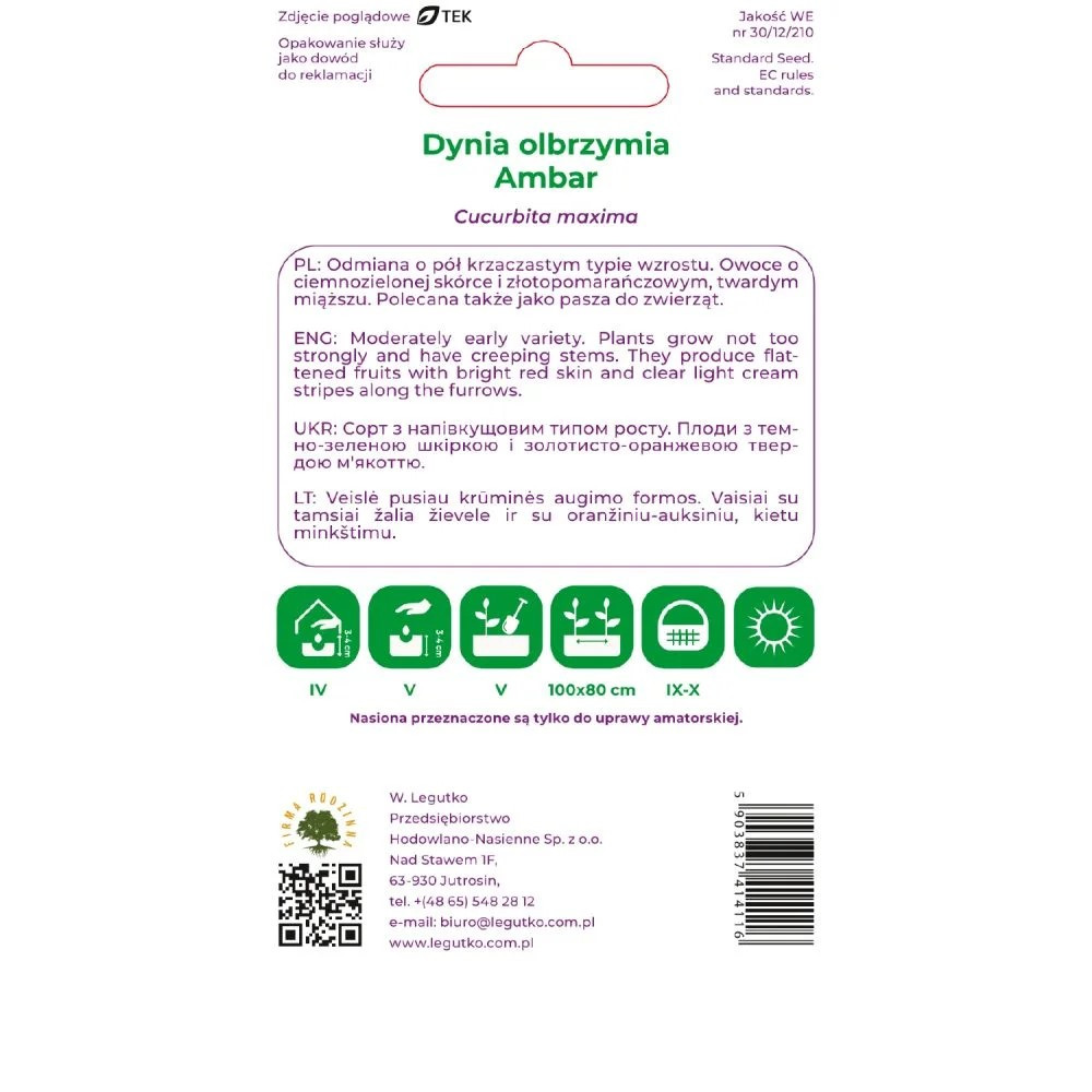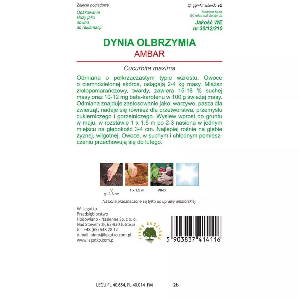Dynia olbrzymia Ambar 3g Cucurbita maxima EAN: 5903837414116 Odmiana o półkrzaczastym typie wzrostu. Owoce o ciemnozielonej skórce, osiągają 2-4 kg masy. Miąższ złotopomarańczowy, twardy, zawiera 15-18% suchej masy oraz 10-12 mg beta- karotenu w 100 g świeżej masy. Odmiana znajduje zastosowanie jako: warzywo, pasza dla zwierząt, nadaje się również dla przetwórstwa, przemysłu cukierniczego i gorzelniczego. Wysiew wprost do gruntu w maju, w rozstawie 2 x 1,5 m po 2-3 nasiona w jednym miejscu na głębokość 3-4 cm. Najlepiej rośnie na glebie żyznej, wilgotnej. Owoce, w suchym i chłodnym pomieszczeniu przechowują się do lutego.
