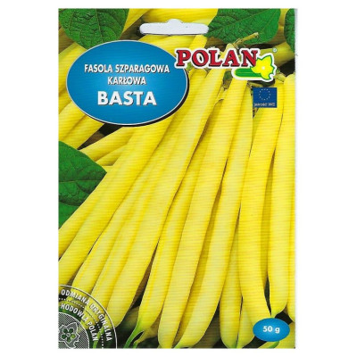 FASOLA SZPARAGOWA KARŁOWA BASTA Charakterystyka i opis: Bardzo wczesna odmiana fasoli szparagowej o krzaczastym, niskim pokroju (karłowa). Tworzy bezwłókniste, proste i gładkie strąki o intensywnie żółtej barwie i długości około 14 cm. Miąższ jest mięsisty, bardzo smaczny, bez tendencji do szybkiego łykowacenia. Odmiana polecana zarówno do bezpośredniego spożycia, jak i do mrożenia oraz konserwowania. Ze względu na wczesność nadaje się do uprawy pod osłonami (folia) oraz w gruncie. Terminy siewu i zbioru: