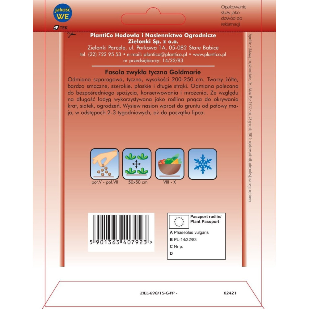 Fasola Szparagowa Tyczna Goldmarie (PlantiCo, 10g) Odmiana Goldmarie to jedna z najlepszych i najbardziej dekoracyjnych odmian fasoli tycznej typu „Mamut”. Ceniona za wczesne plonowanie, brak włókien oraz imponujący wygląd długich, złocistych strąków. Dzięki silnemu wzrostowi doskonale sprawdza się nie tylko jako warzywo użytkowe, ale także jako roślina pnąca osłaniająca altany czy płoty.