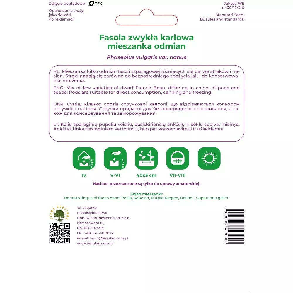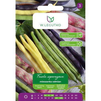 Fasola zwykła mieszanka odmian 40g Fasola zwykła - Phaseolus vulgaris var. nanus - mieszanka odmian - 40.00g EAN: 5903837423903 Mieszanka kilku odmian fasoli szparagowej różniących się barwą strąków i nasion, dających już w ogródku ciekawy efekt kolorystyczny. Strąki nadają się zarówno do bezpośredniego spożycia jak i do konserwowania, mrożenia. Wysiew nasion od początku maja do połowy lipca w rozstawie 35-40 x 7-10 cm na głębokość 2-3 cm. Najlepiej plonuje w drugim roku po oborniku. Skład mieszanki fasoli % udział Galopka 25% Cropper Teepee 25% Borlotto lingua di fuoco nano 25% Purple Teepee 25% Kolor: mieszanka Stanowisko: słoneczne Sezonowość: jednoroczne Termin wysiewu pod osłony: kwiecień Termin wysiewu wprost do gruntu: maj , czerwiec Termin zbioru: lipiec , sierpień Seria nasion: Seria Tradycyjna Ilość nasion w gramie (średnia): 2