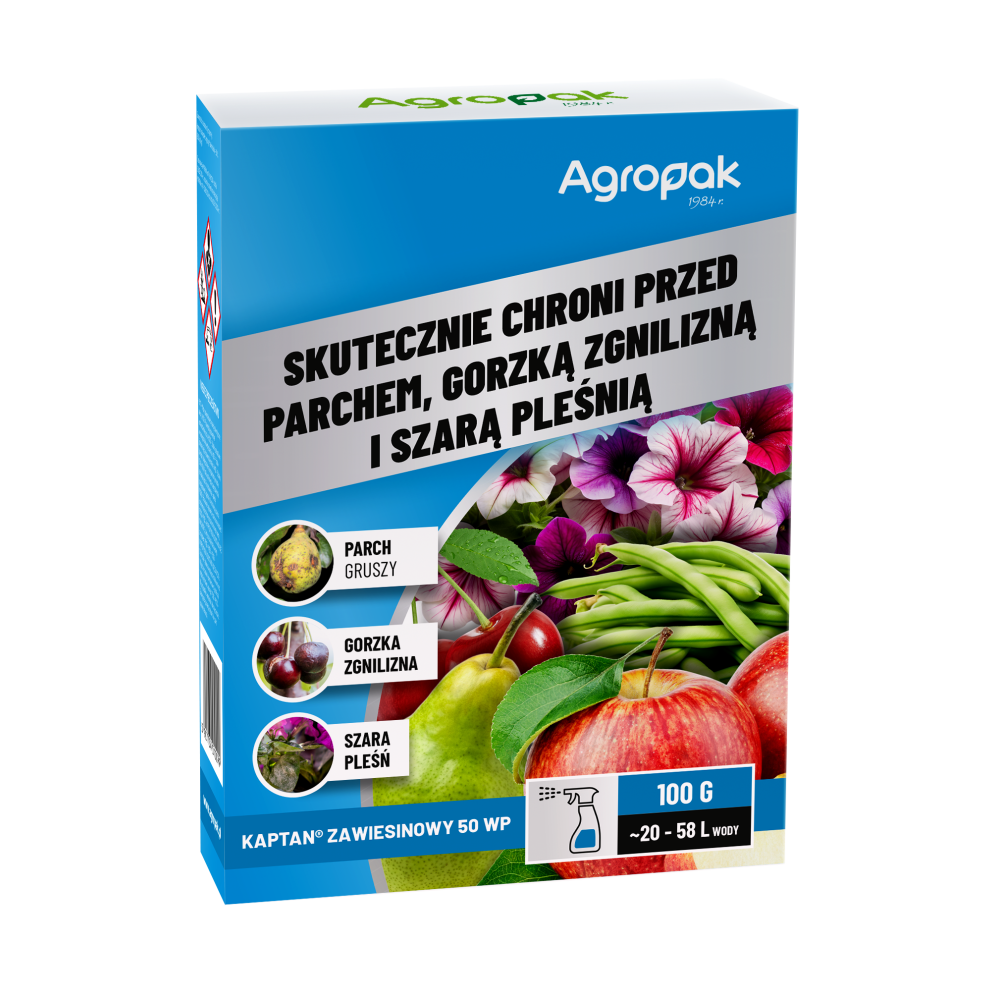 | jabłoń, grusza | 30 g środka w 6 L wody / 100 m2 | parch jabłoni |