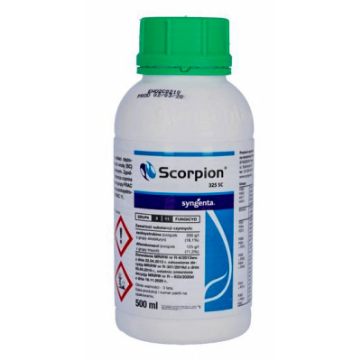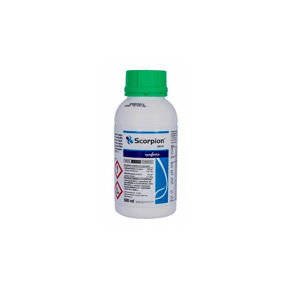 Scorpion 325 SC 5L jest to fungicyd, koncentrat w postaci stężonej zawiesiny do rozcieńczania wodą (SC) o działaniu wgłębnym i układowym, stosowany zapobiegawczo i interwencyjnie w zwalczaniu chorób powodowanych przez grzyby. Zgodnie z klasyfikacją FRAC substancja czynna difenokonazol zaliczana jest do grupy FRAC 3, natomiast substancja czynna azoksystrobina zaliczana jest do grupy FRAC 11.
