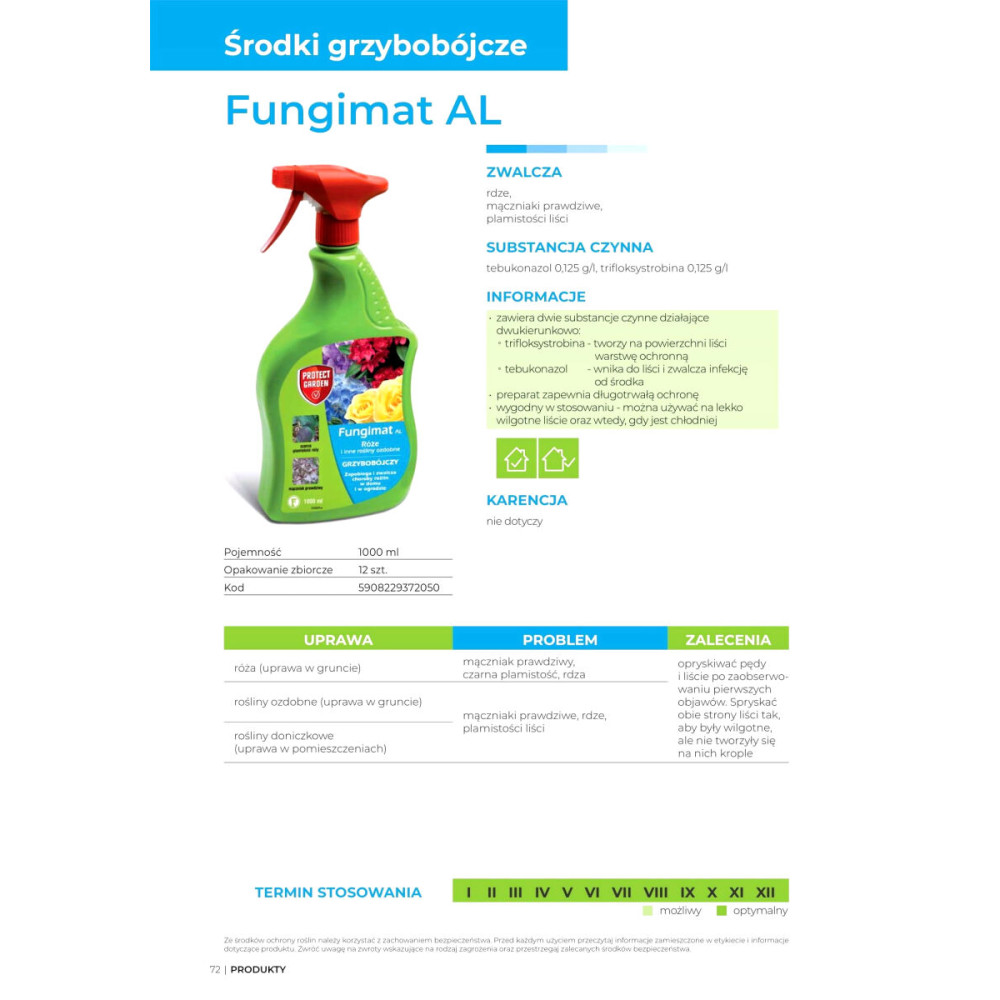 Fungimat chroni roże oraz rośliny ozdobne- zwalcza mączniaka prawdziwego, czarną plamistość i rdze oraz zarazę pędów bukszpanu. Zawiera tebukonazol, który wnika do liści i zwalcza infekcję od środka.