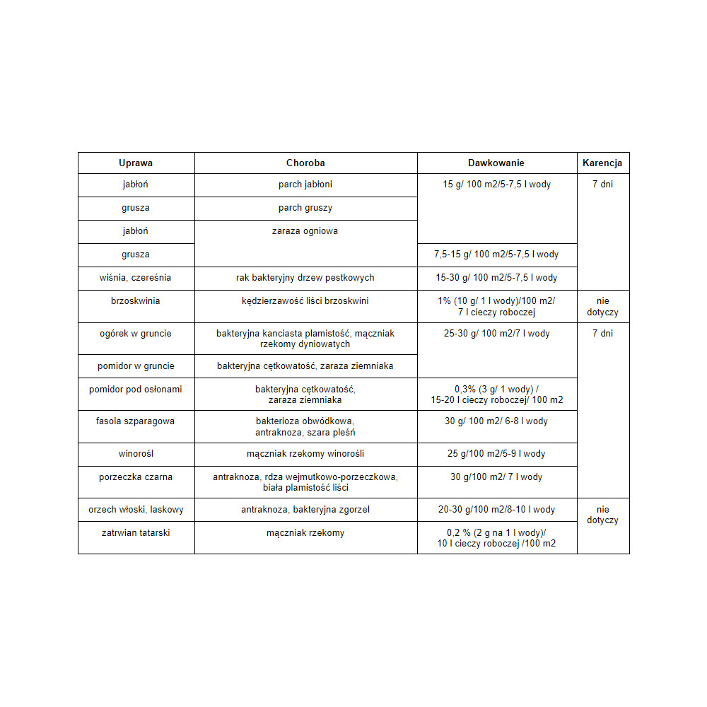 Dawkowanie produktu - Miedzian 50 WP (tlenochlorek miedzi)