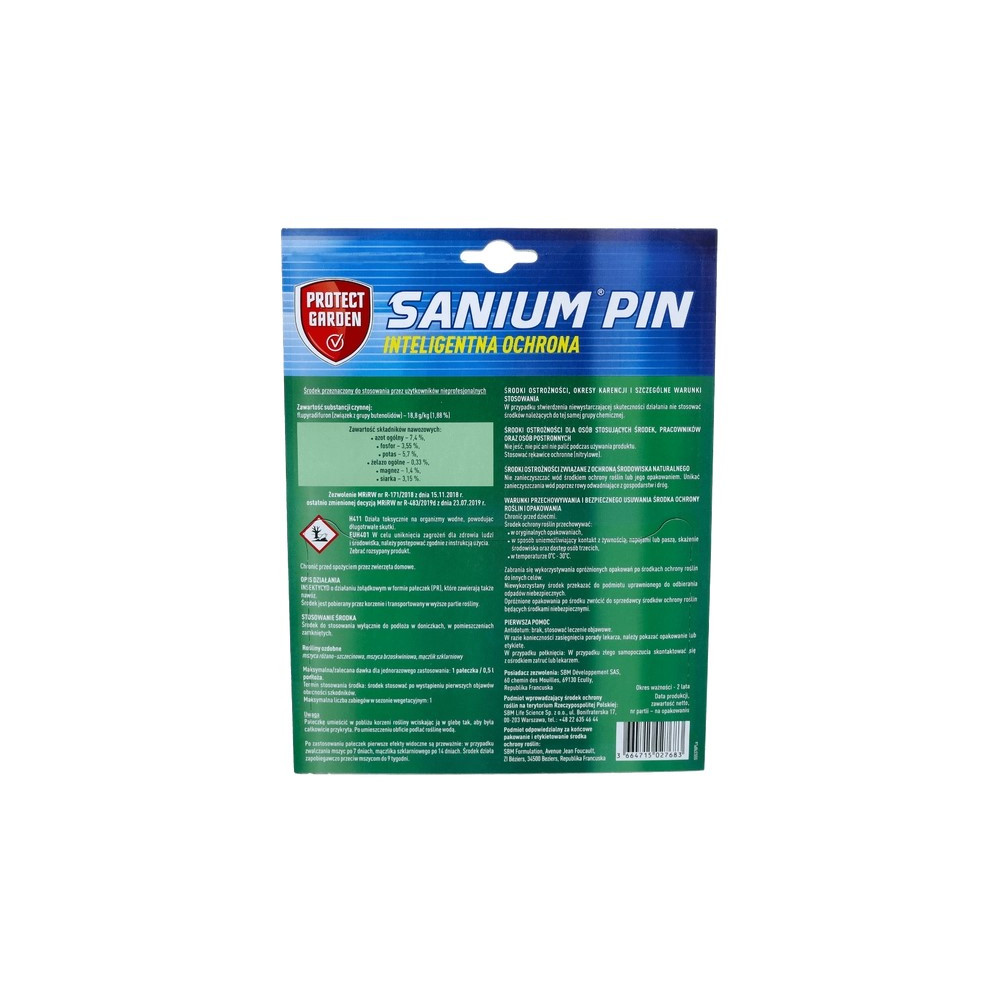 Dzięki modyfikacjom cząsteczki aktywnej, preparat "rozpoznaje" różnice, na poziomie receptorów, między szkodnikami, na które działa, a owadami pożytecznymi, dla których jest wyjątkowo bezpieczny. Sanium PIN jest dostępny w postaci pałeczek doglebowych i oprócz substancji owadobójczej zawiera składniki nawozowe, dzięki czemu poprawia wygląd roślin. Środek jest w postaci pałeczek do stosowania doglebowo w uprawie roślin ozdobnych, doniczkowych wewnątrz pomieszczeń.