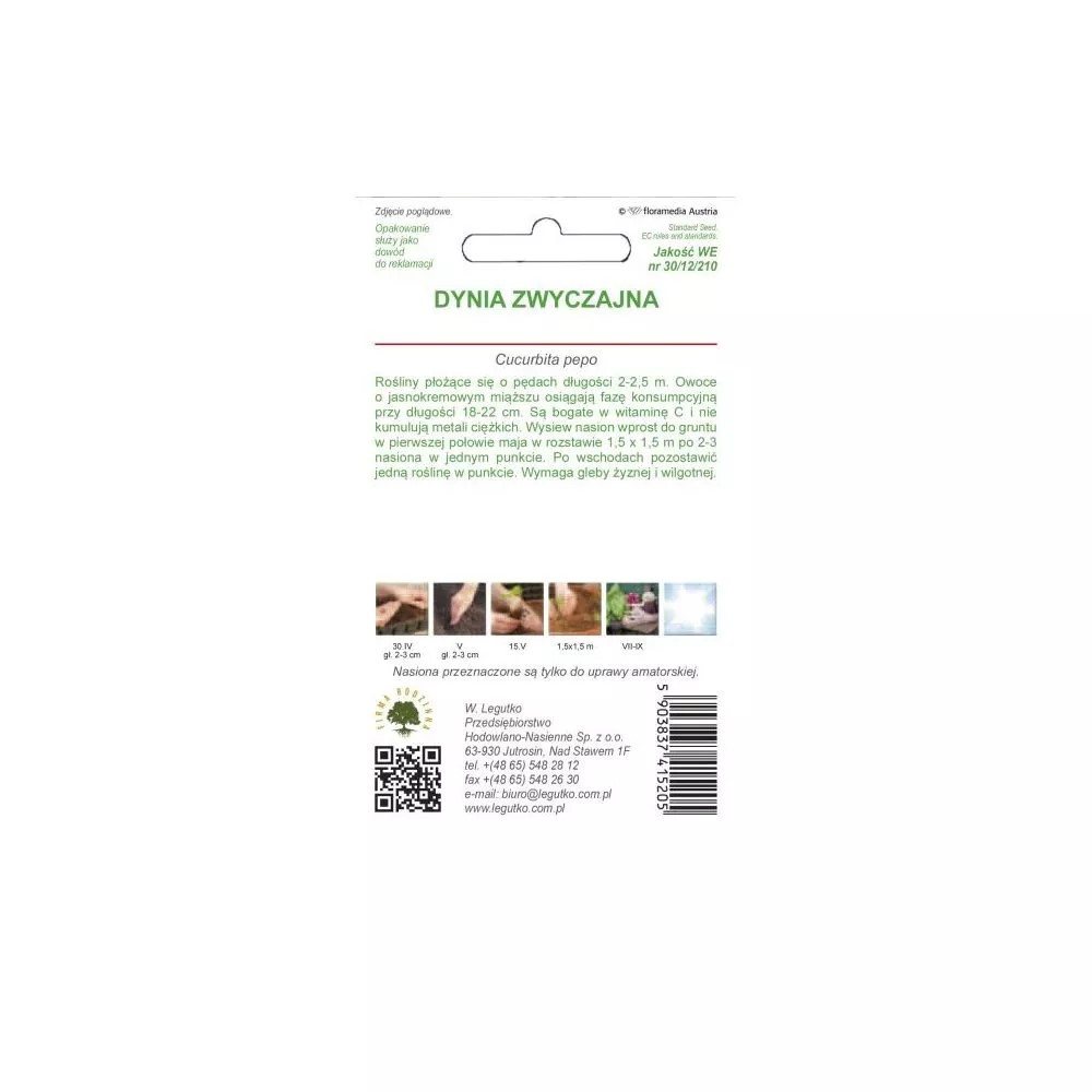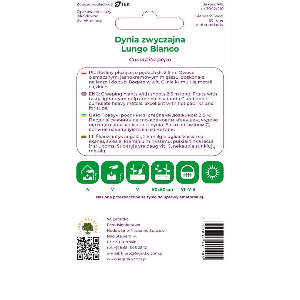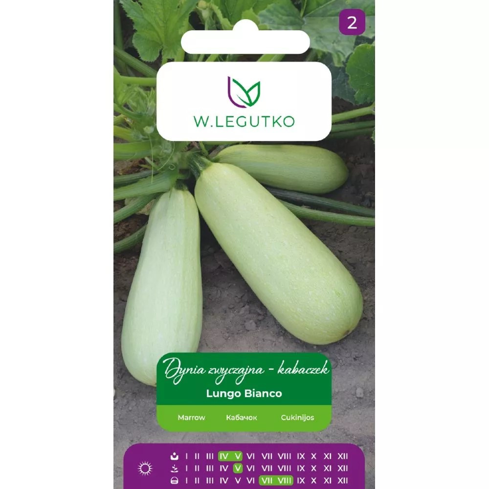 Kabaczek Lungo bianco 2g Dynia zwyczajna - Cucurbita pepo - Lungo bianco - biały - 2.00g EAN: 5903837415205 Rośliny płożące się o pędach długości 2-2,5 m. Owoce o jasnokremowym miąższu osiągają fazę konsumpcyjną przy długości 18-22 cm. Są bogate w witaminę C i nie kumulują metali ciężkich. Wysiew nasion wprost do gruntu w pierwszej połowie maja w rozstawie 1,5 x 1,5 m po 2-3 nasiona w jednym punkcie. Po wschodach pozostawić jedną roślinę w punkcie. Wymaga gleby żyznej i wilgotnej. Kolor: kremowy Stanowisko: słoneczne Sezonowość: jednoroczne Termin wysiewu pod osłony: kwiecień Termin wysiewu wprost do gruntu: maj Termin wysadzenia na miejsce stałe: maj Seria nasion: Seria Tradycyjna Ilość nasion w gramie (średnia): 7