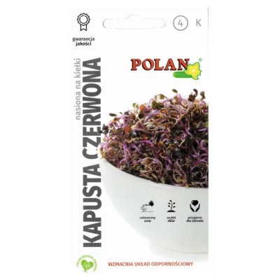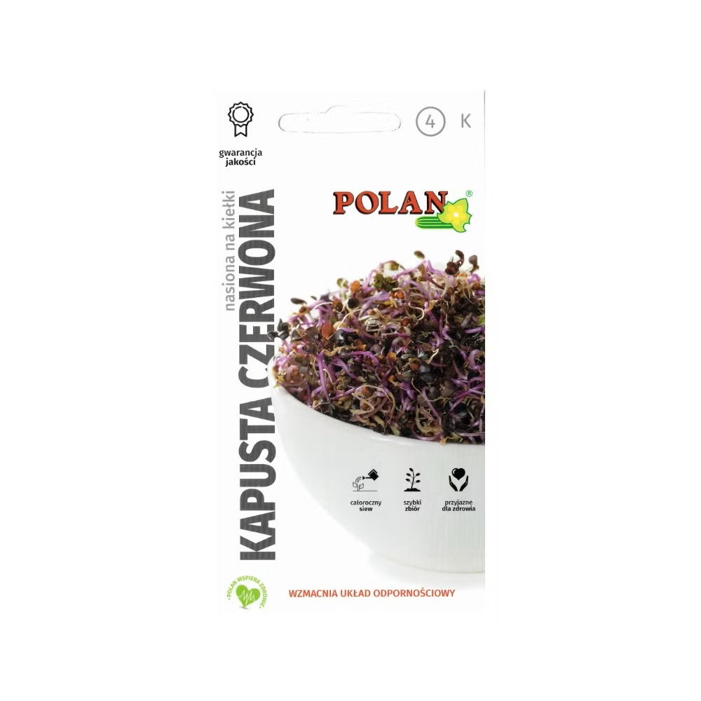 NASIONA NA KIEŁKI KAPUSTA CZERWONA Charakterystyka i opis: Kiełki kapusty czerwonej są cenione za wysoką zawartość antyoksydantów (antocyjanów), witamin (A, B, C, E, K) oraz cennych minerałów, takich jak wapń, żelazo i magnez. Posiadają łagodny, lekko słodkawy smak i charakterystyczną, fioletowo-purpurową barwę, która stanowi efektowny element dekoracyjny potraw. Wspomagają układ odpornościowy, nerwowy oraz poprawiają kondycję skóry. Terminy siewu i zbioru:
