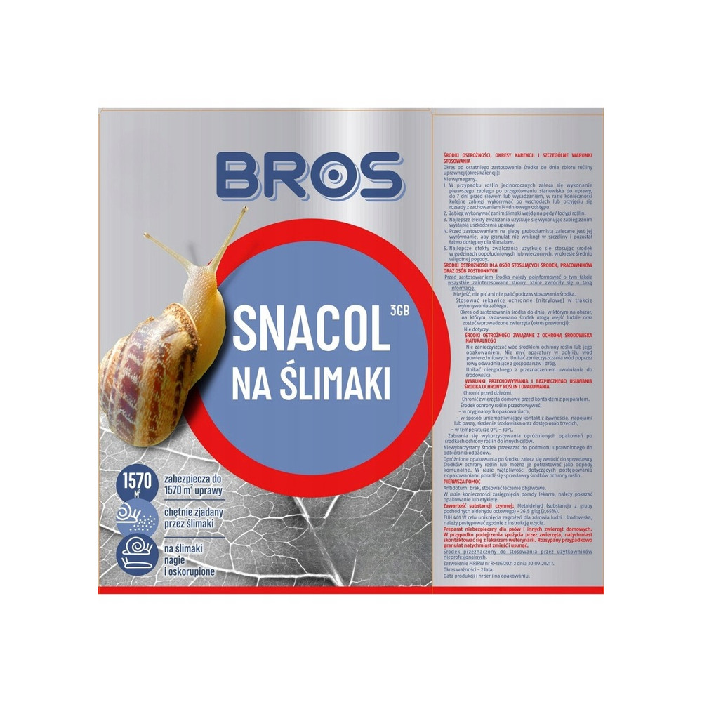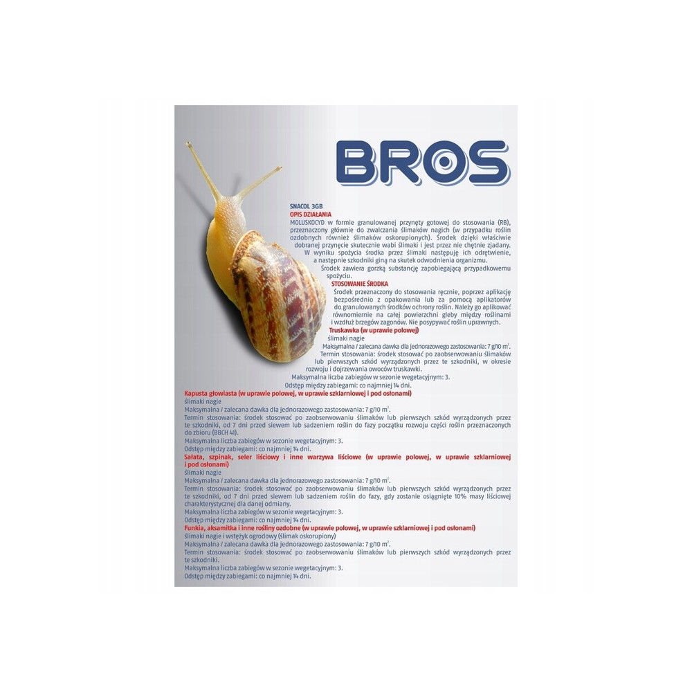 - Termin stosowania: środek stosować po zaobserwowaniu ślimaków lub pierwszych szkód wyrządzonych przez te szkodniki, od 7 dni przed siewem lub sadzeniem roślin do fazy początku rozwoju części roślin przeznaczonych do zbioru (BBCH 41).