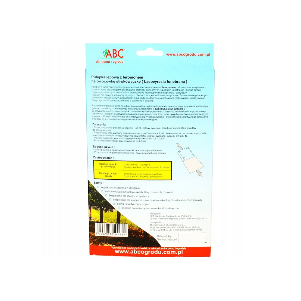 Pułapka z tworzywa sztucznego powleczona specjalnym klejem z feromonem, odpornym na wysychanie, przemoczenie oraz długotrwałe działanie promieni słonecznych. Specjalna konstrukcja i kształt pułapki zapobiega zanieczyszczeniu liśćmi, jednocześnie jest bezpieczna dla ptaków i zapylaczy. Pułapka nie zawiera substancji czynnych chemicznie - jest wolna od pestycydów. Zastosowanie pułapek jest działaniem prewencyjnym, pozwalającym na podjęcie decyzji o ewentualnym zastosowaniu insektycydów. Próg zagrożenia oznaczają średnio 2 owady na 1 pułapkę.