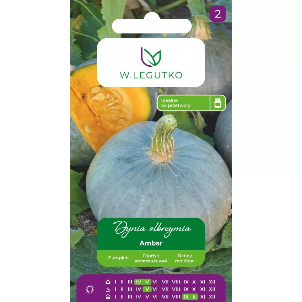 Dynia olbrzymia Ambar 3g Cucurbita maxima EAN: 5903837414116 Odmiana o półkrzaczastym typie wzrostu. Owoce o ciemnozielonej skórce, osiągają 2-4 kg masy. Miąższ złotopomarańczowy, twardy, zawiera 15-18% suchej masy oraz 10-12 mg beta- karotenu w 100 g świeżej masy. Odmiana znajduje zastosowanie jako: warzywo, pasza dla zwierząt, nadaje się również dla przetwórstwa, przemysłu cukierniczego i gorzelniczego. Wysiew wprost do gruntu w maju, w rozstawie 2 x 1,5 m po 2-3 nasiona w jednym miejscu na głębokość 3-4 cm. Najlepiej rośnie na glebie żyznej, wilgotnej. Owoce, w suchym i chłodnym pomieszczeniu przechowują się do lutego.