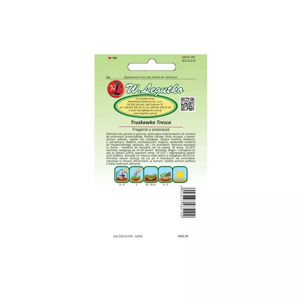 Truskawka Tresca 0.03g Fragaria x ananassa - Tresca EAN: 5903837485130 Odmiana truskawki do uprawy w gruncie, owocująca nieprzerwanie od czerwca do jesiennych przymrozków.Rośliny niezbyt silnie rosnące o wzniesionym pokroju, zwykle bez rozłogów. Owoce średniej wielkości o czerwonym, słodkim aromatycznym miąższu, doskonałe zarówno do bezpośredniego spożycia jak i na przetwory. Nasiona wysiewać w marcu - kwietniu do skrzynek lub na palety.W temp. 16-20°C. wschody następują po 14-20 dniach. Rozsadę na miejsce stałe sadzić w odległości 35-40cm. Pierwsze owoce ukazują się już po 4 miesiącach od wschodów.Uprawiać w miejscu słonecznym, w żyznym, niezbyt suchym podłożu o lekko kwaśnym odczynie. Kolor: czerwony Stanowisko: słoneczne Sezonowość: wieloletnie Termin wysiewu pod osłony: marzec , kwiecień Termin wysadzenia na miejsce stałe: maj Termin zbioru: czerwiec , lipiec , sierpień , wrzesień , październik