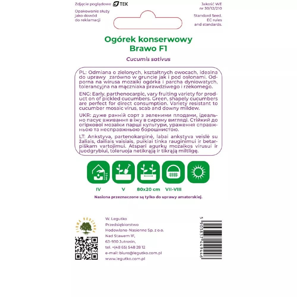 Ogórek Brawo F1 2g Cucumis sativus - Brawo F1 EAN: 5903837449446 Ogórek ten stanowi najnowszą propozycję firmy W. Legutko, przeznaczoną do uprawy pod wysokimi i niskimi osłonami. To wczesna partenokarpiczna, bardzo plenna odmiana, doskonała do produkcji ogórka małosolnego oraz do kwaszenia. Zielone, kształtne owoce ze średnią brodawką są doskonałe do bezpośredniego spożycia. Odmiana Brawo F1 dorównuje najlepszym odmianom zagranicznym pod względem plonu oraz jakości owoców. Ponadto wyróżnia się odpornością na wirusa mozaiki ogórka i parcha dyniowatych oraz cechuje wysoką tolerancją na mączniaka rzekomego i prawdziwego.