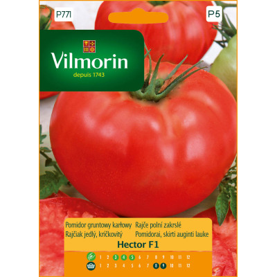 POMIDOR HECTOR F1 grunt.i p/osł. 0,1g Odmiana średniowczesna, bardzo plenna, odporna na wiele chorób. Tworzy duże, słodkie, smaczne i dość twarde owoce. Przeznaczenie: doskonały na przeciery, pasty, soki oraz do bezpośredniego spożycia. W pobliżu pomidora dobrze jest wysiać aksamitkę i nasturcję, które odstraszą mszyce.