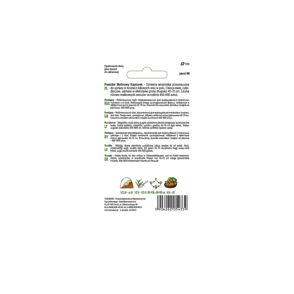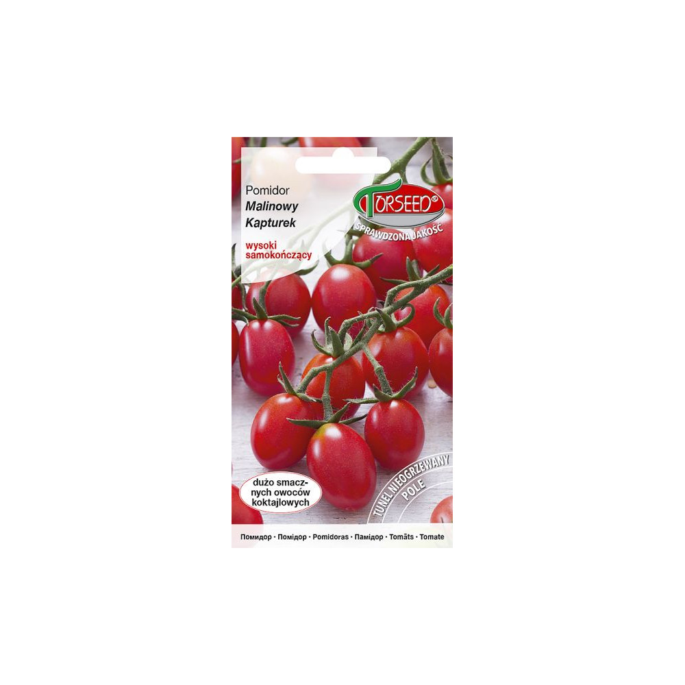 Pomidor wysoki Malinowy Kapturek - typ cherry Gatunek: Pomidor wysoki Rodzaj: wysoki Wczesność: bardzo wczesna Ilość: 0.1grama Pomidor wysoki Malinowy Kapturek – typ cherry. Odmiana amatorska przeznaczona do uprawy w tunelach foliowych oraz w polu. Owoce małe, cylindryczne, zebrane w efektowne grona długości 45-75 cm. Liczba różowo-malinowych owoców na roślinie 450-600 szt. Gramatura – 0,1 grama.