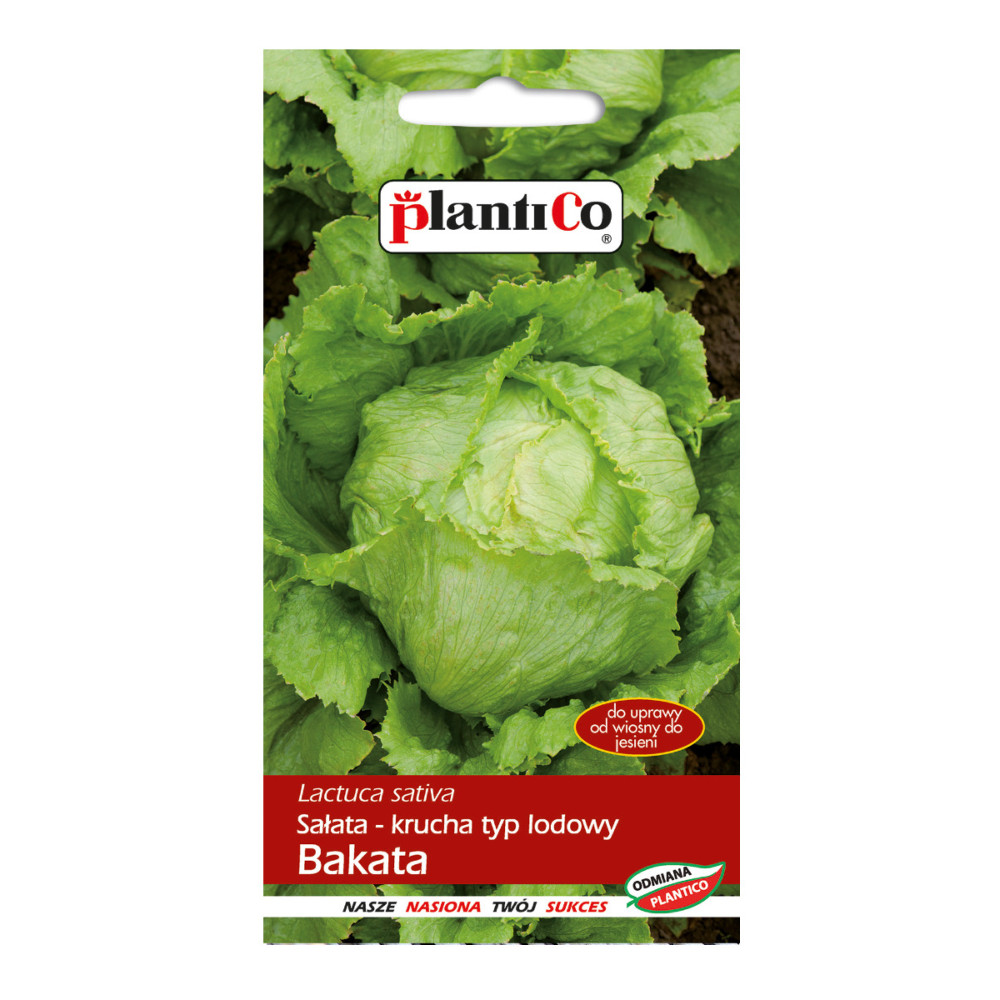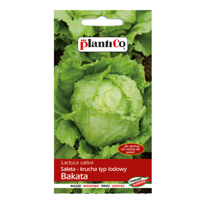 Sałata głowiasta krucha Bakata – 1g PlantiCo Średniopóźna, bardzo plenna odmiana sałaty kruchej (typu lodowego), ceniona za wyjątkową wielkość i trwałość. Tworzy duże, ścisłe, zamknięte główki, których masa może przekraczać 1000 g. Liście są soczyste, kruche, ciemnozielone, o lśniącej powierzchni i atrakcyjnie powycinanych brzegach. Charakterystyka i zastosowanie: