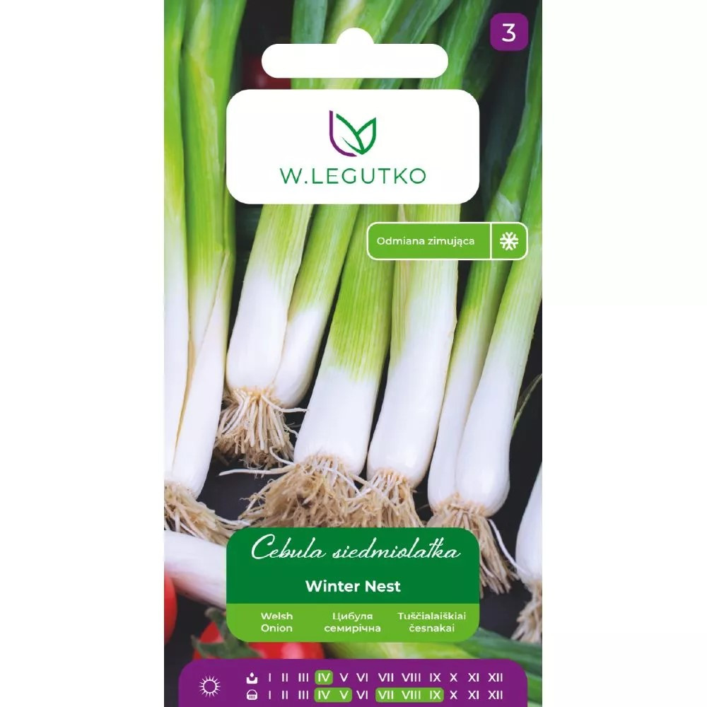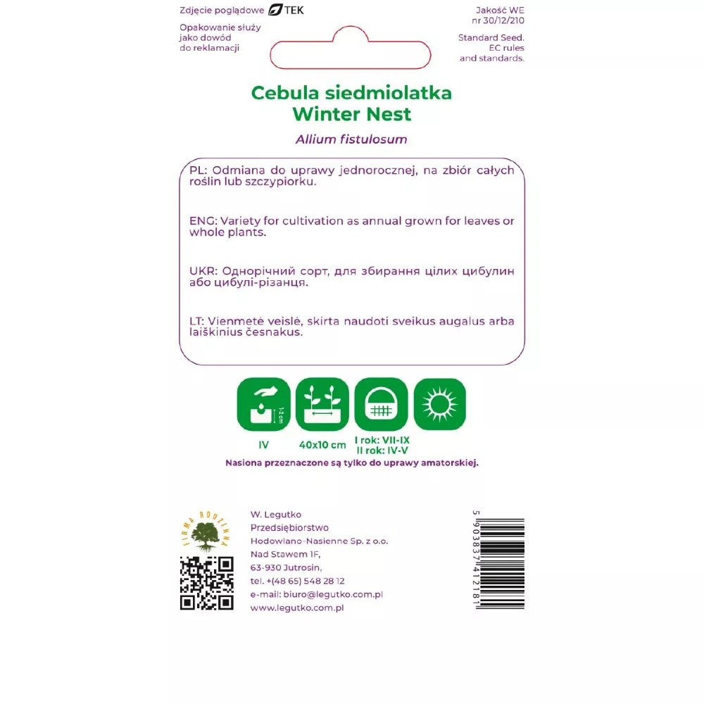 Cebula siedmiolatka Winter Nest 2g Allium fistulosum EAN: 5903837412181 Roślina trwała, mrozoodporna - na jednym miejscu nie powinna jednak pozostawać dłużej niż 3-4 lata, bo silnie wyjaławia glebę i zachwaszcza się. Użytkuje się szczypior. W przypadku uprawy odmiany w cyklu jednorocznym, można użytkować całe rośliny. Wysiew wprost do gruntu od kwietnia do końca sierpnia w rzędy co 40 cm. Gdy rośliny osiągną wysokość ok. 5 cm należy wykonać przerywkę, pozostawiając rośliny co kilka cm. Zbiór szczypioru od kwietnia do końca września. Zbiór całych roślin we wrześniu tego samego roku.