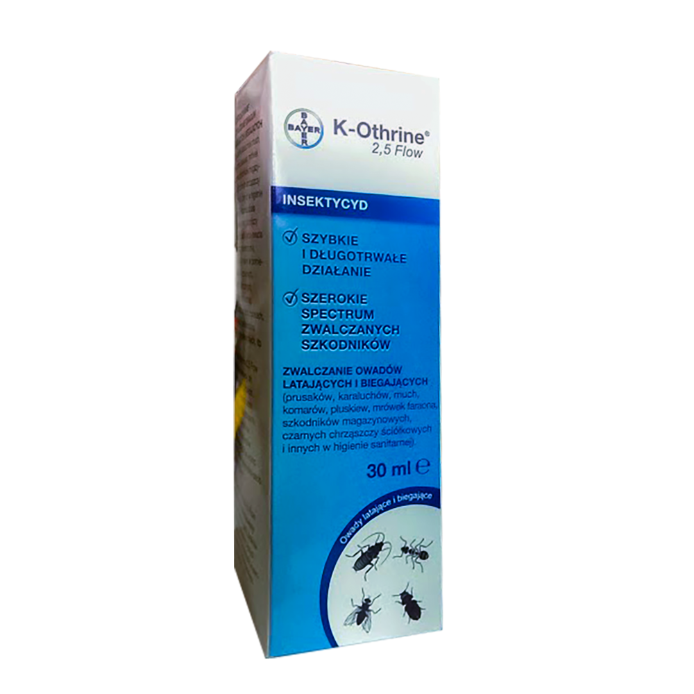 100 ml produktu K-Othrine 2,5 Flow zmieszać z 10 l wody. Sporządzoną mieszaniną (1%) opryskać drogi przebiegu i miejsca gromadzenia się owadów, używając ok. 50 ml roztworu na 1 m² powierzchni. Przed opryskiem należy oczyścić powierzchnie, na które będzie dozowany roztwór. Opryskiwać ściany, sufity, powierzchnie wokół okien i inne miejsca, na których owady chętnie siadają. Jeżeli to możliwe, należy opryskać również miejsca składowania obornika i ściółki oraz zużytą ściółkę, którą należy przechowywać jak najdalej od budynków inwentarskich. W miejscach, gdzie ze względu na szybki rozwój populacji owadów może pojawić się odporność, powinno się stosować rotację produktów, tzn. używać środków zawierających substancje czynne należące do różnych grup chemicznych.