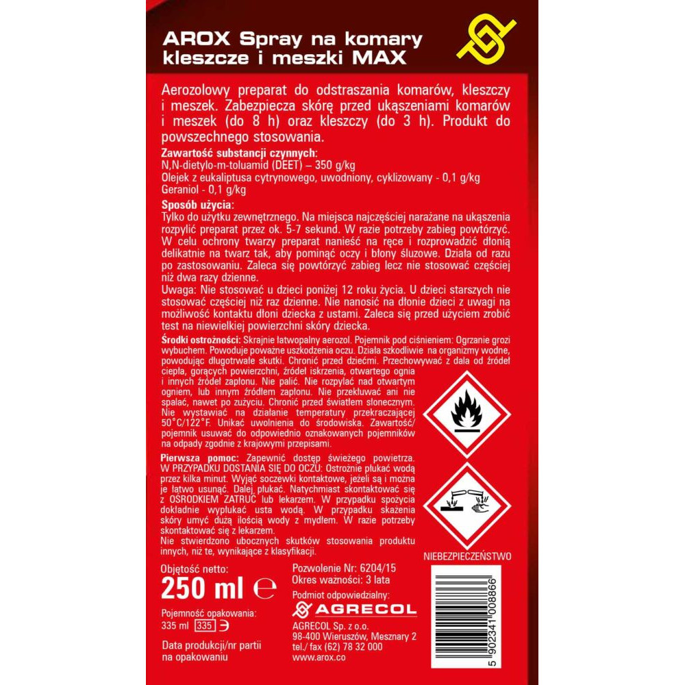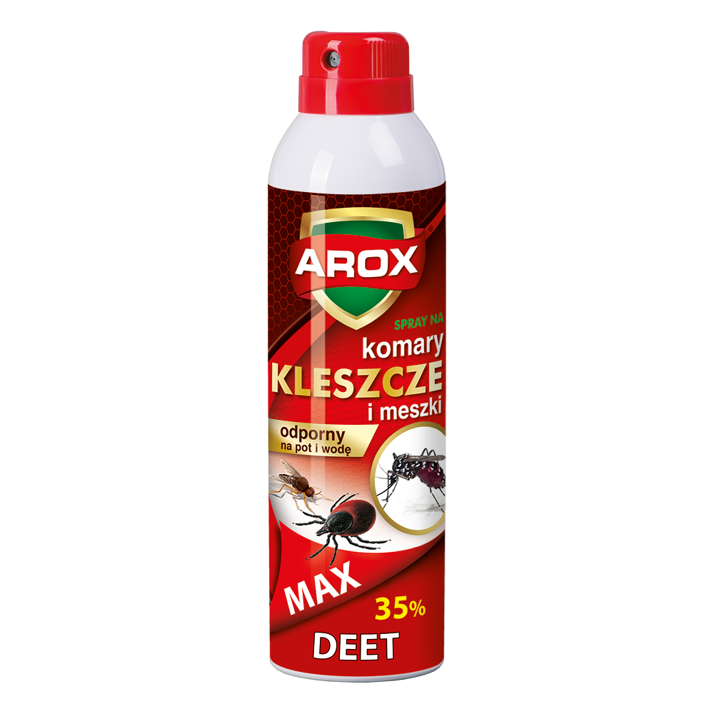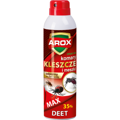 Spray Deet MAX na kleszcze, komary i meszki – aerozolowy preparat do odstraszania owadów i pajęczaków. Zawiera substancję repelencyjną DEET o stężeniu 35%. Zabezpiecza skórę przed komarami i meszkami przez 8 h, a kleszczami przez 3 h.