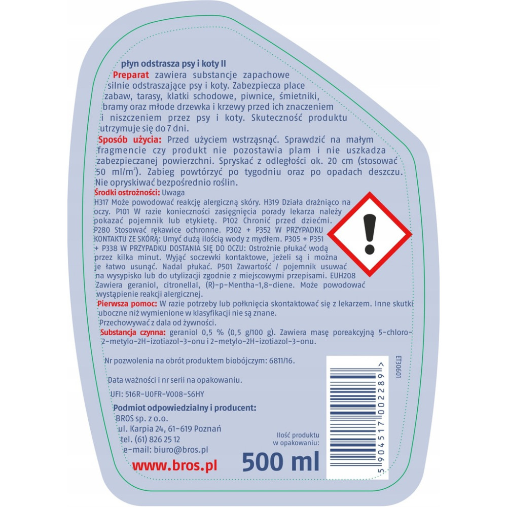 Preparat zawiera substancje zapachowe silnie odstraszające psy i koty. Zabezpiecza place zabaw, tarasy, klatki schodowe, piwnice, śmietniki, bramy oraz młode drzewka i krzewy przed ich znaczeniem i niszczeniem przez psy i koty. Skuteczność produktu utrzymuje się do 7 dni.