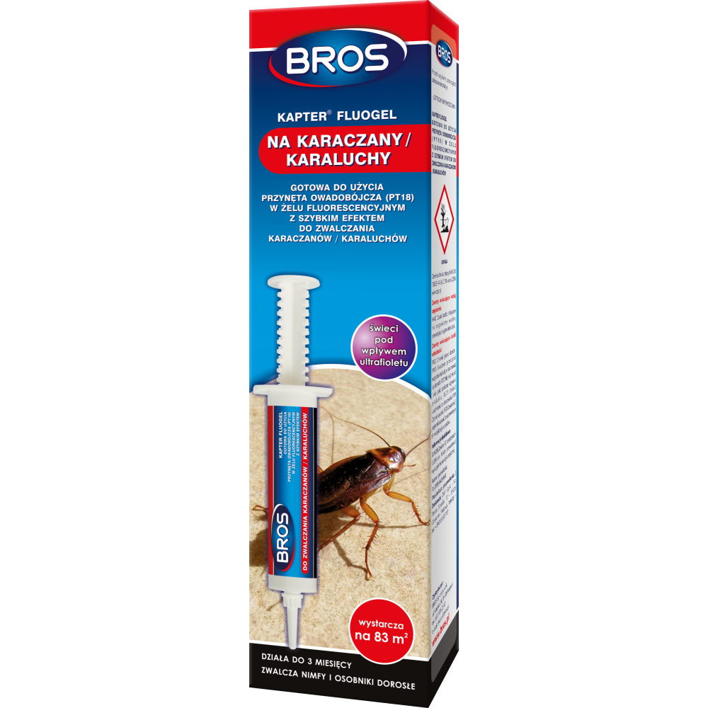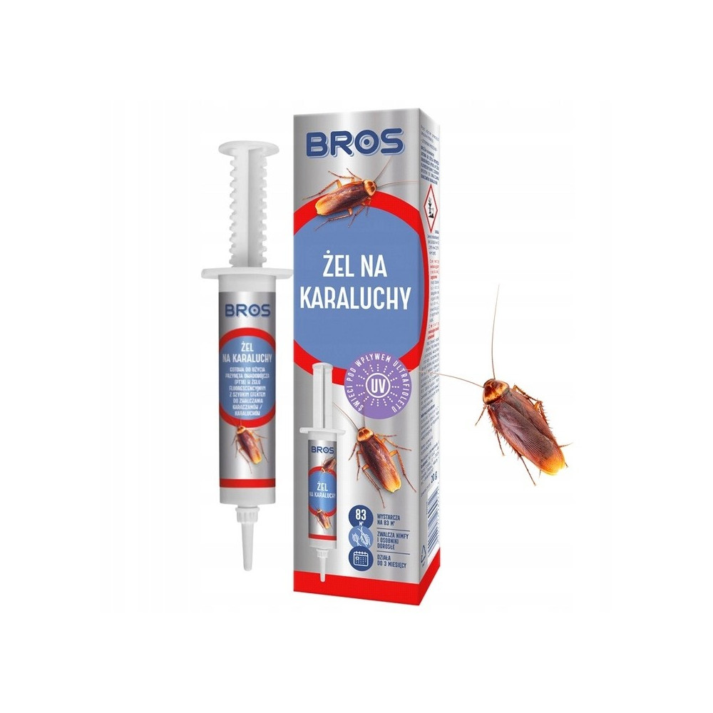 Preparat zwalcza populację karaczanów w ciągu 1 tygodnia od zastosowania. Ma jasną, neutralną barwę, umożliwiając dyskretne zastosowanie. Zawiera fluorescencyjny marker, pozwalający stwierdzić obecność kropel po oświetleniu światłem ultrafioletowym. Fluorescencja pozwala zatem, nawet w najbardziej ukrytych miejscach, na szybką kontrolę, łatwą identyfikację pozostałości, celowe czyszczenie, identyfikowanie martwych owadów, zwłaszcza tych o dużych rozmiarach. BROS Żel na karaluchy, dzięki swojej przyczepności, ułatwia aplikację oraz nie ścieka, nawet po nałożeniu na pionowe powierzchnie. Ponadto nie twardnieje przez długi czas, wykazując skuteczność resztkową powyżej 3 miesięcy od zastosowania.