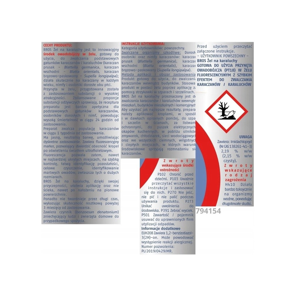 Metoda aplikacji i obszar zastosowania: Produkt gotowy do użycia, do zwalczania karaczanów wewnątrz budynków. Stosować produkt w postaci żelu poprzez aplikację za pomocą strzykawki w szparach i szczelinach. BROS Żel na karaluchy przeznaczony jest do zwalczania karaczanów/karaluchów wewnątrz mieszkań, budynków mieszkalnych i komercyjnych. Aby uzyskać jak najlepsze rezultaty, preparat należy aplikować kroplami, w sposób i w dawkach opisanych poniżej, do szpar i szczelin w ścianach, za listwami ochronnymi, do puszek elektrycznych, okapów kuchennych, w pobliżu silników zmywarek, chłodziarek, sieci wodociągowych oraz we wszystkich ciemnych, wilgotnych i ciepłych miejscach, w których warunki środowiskowe sprzyjają rozmnażaniu się karaczanów.