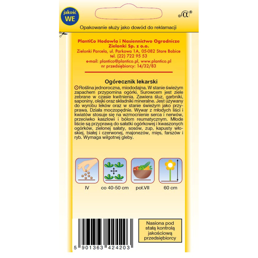 OGÓRECZNIK LEKARSKI Charakterystyka i opis: Roślina jednoroczna, miododajna i przyprawowa o wzniesionym pokroju, dorastająca do 60–80 cm wysokości. Cała roślina jest szorstko owłosiona. Tworzy bardzo dekoracyjne, zwisające kwiaty w kolorze intensywnego błękitu. Liście i młode pędy mają charakterystyczny, orzeźwiający zapach i smak świeżego ogórka. Jest cennym surowcem zielarskim (zawiera flawonoidy i śluz) oraz doskonałym dodatkiem do sałatek, twarogów, napojów i dekoracji potraw (kwiaty są jadalne). Terminy siewu i zbioru: